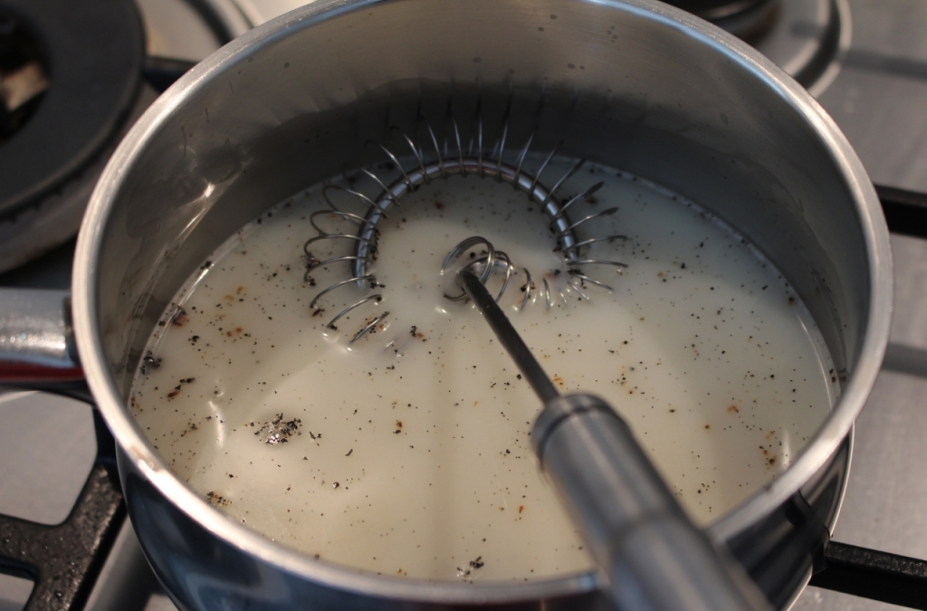 Melk met suiker en vanillestok aan de kook brengen